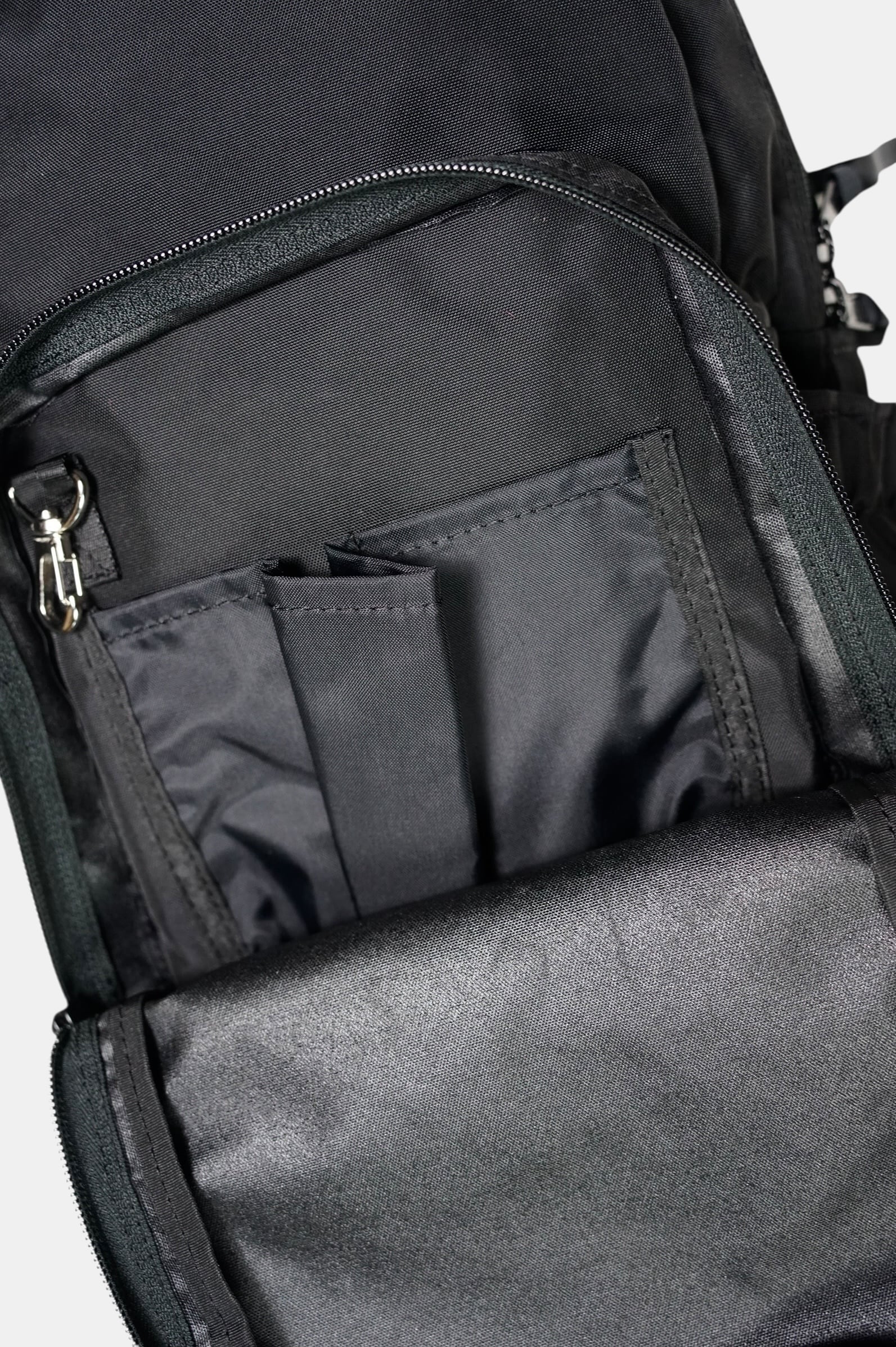 ・大きめのフロントポケットには2つに分かれた内ポケットとキーホルダーを装備